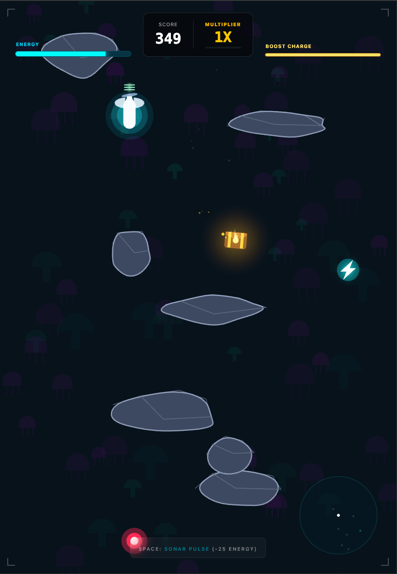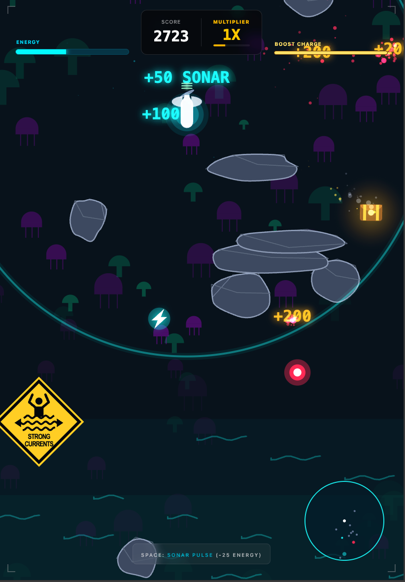 The chest is sinking. Plunge into the ocean to catch it. Navigate jagged rocks and use your sonar to blast mines out of your way. Just don’t forget to recharge—if your energy hits zero, the ocean wins.